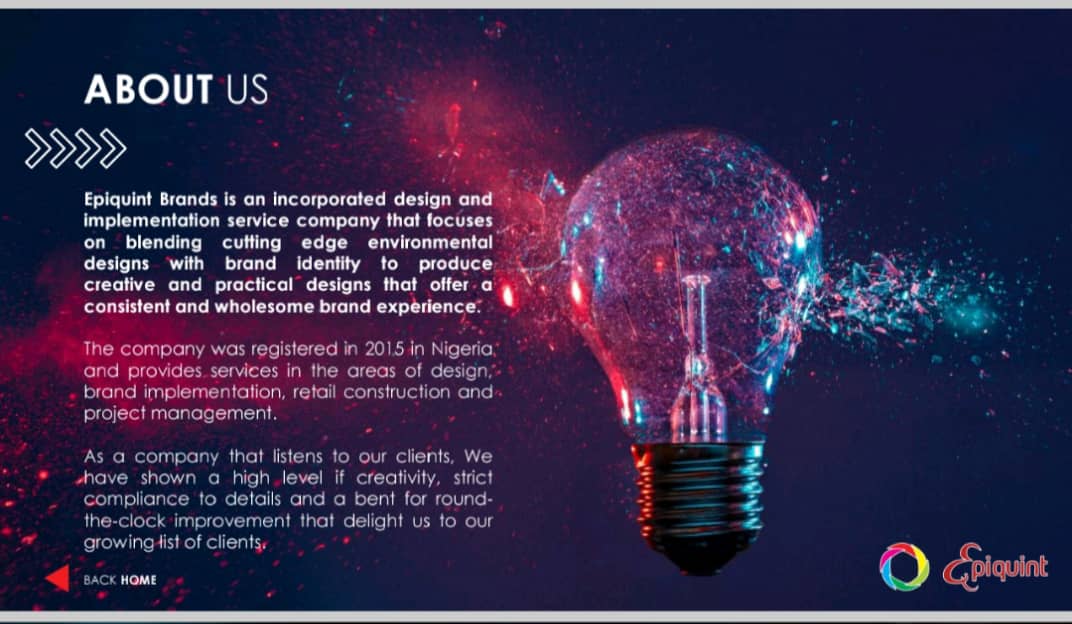 Epiquint Brands is an incorporated design and implementation service company that focuses on blending cutting edge environmental designs with brand identity to produce creative and practical designs that offer a consistent and wholesome brand experience